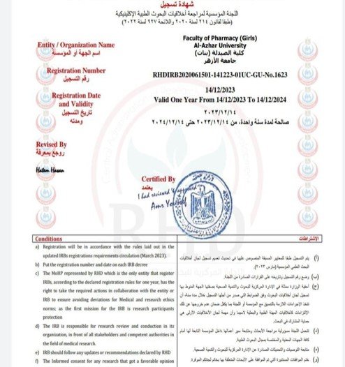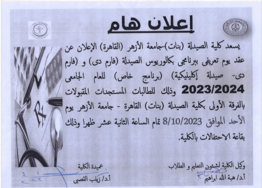 أتمنى لكن النجاح والتوفيق في هذه الكلية العريقة، كلية الصيدلة (بنات) في جامعة الأزهر، تلك المؤسسة التعليمية المرموقة، التي توفر لطالباتها فهمًا علميًا وعمليًا في مجال الصيدلة. فتعمل الكلية على تقليل الفجوة بين الدراسة الأكاديمية وطبيعة العمل، وذلك من خلال تقديم وتطوير البرامج المختلفة، بالإضافة إلى دعم روح الابتكار لديكن عن طريق مبادرات ريادة الأعمال.